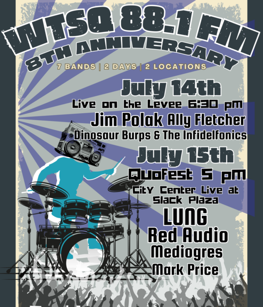 It is WTSQ’s 8th Anniversary this summer! Yes, WTSQ went on the air 8 years ago, and thanks to our listeners, members, underwriters, and donations, we are still going strong! Come party with us on July 14th and July 15th! ALL events are for ALL AGES!Below the “Basic Information” section are more details. Also, get more details and RSVP on our FACEBOOK EVENT PAGE—————————————————–BASIC INFORMATION:Friday, July 14th at 6:30 pmWTSQ Night at Live on the LeveeCome to Live on the Levee when WTSQ does an 8th-anniversary takeover!Bands Include: Jim Polak, Ally Fletcher, Dinosaur Burps & The Infidelfonics and a special guest appearance from Duck City Music!